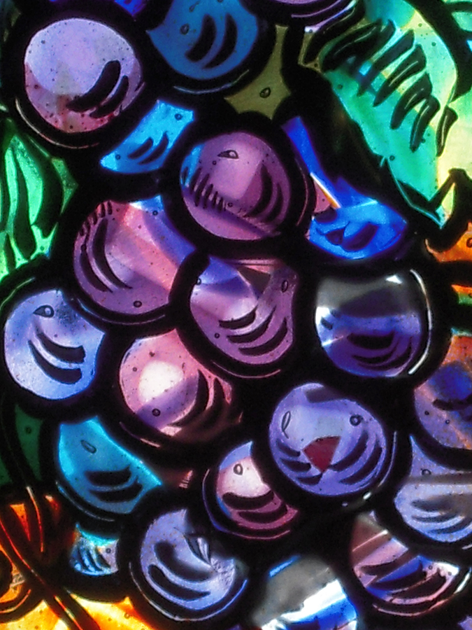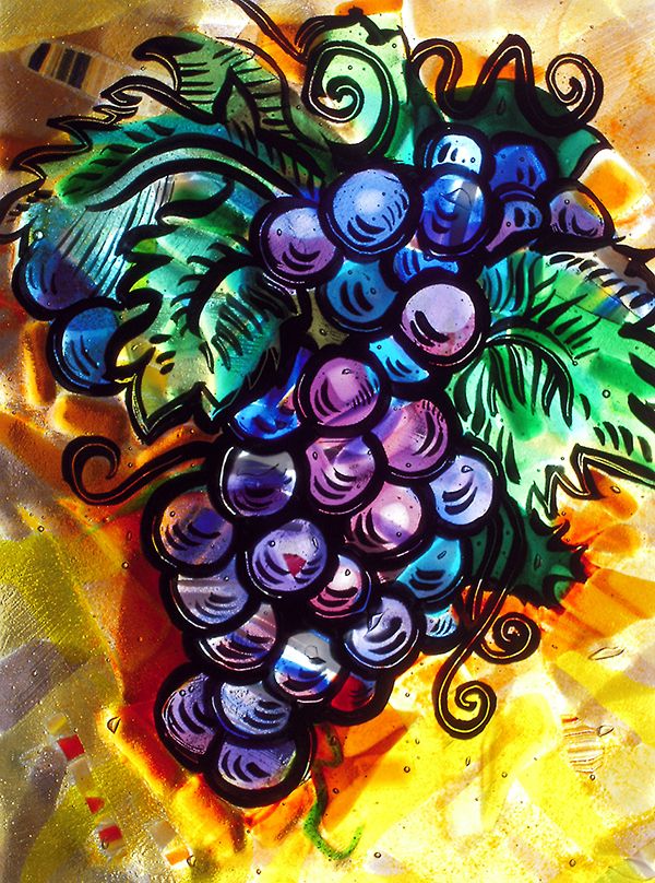 Grapes of the Okanagan This a solid fused panel and is 9" x 12" by A.Zissoff depicting grapes and foliage. Solid black laquered wood frame included.